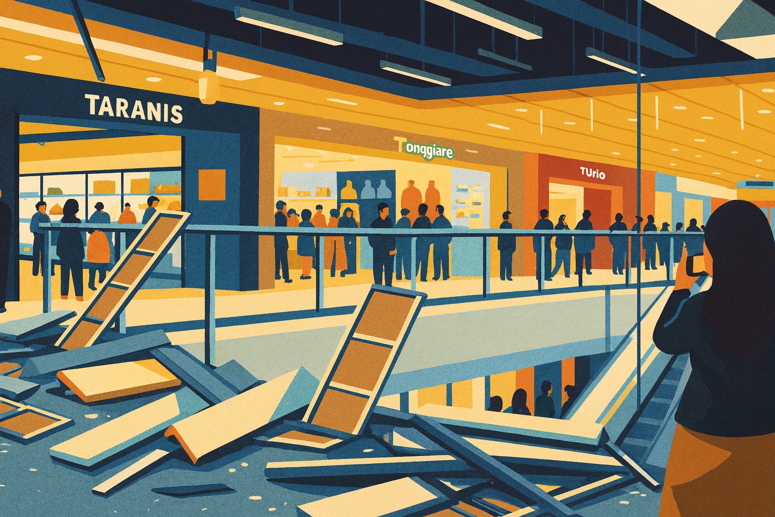 11月17日午前、陝西省西安市の新城区にある大型商業施設「龍湖長楽天街」で仮天井が崩落し、来店客8人が負傷した。事故が発生したのは開業からわずか3日後で、崩落したのは商場3階、エスカレーター上部の天井部分だった。落下面積は約30平方メートルに及び、天井板や金具が下階まで飛散し、現場には大量の粉じんが充満した。映像には血痕、破片、倒れ込む買い物客が映っており、現場の混乱が明らかになった。