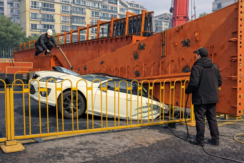 今回の事故で最も問題視されているのは、施工側の安全管理体制である。通常、これほど巨大な重量物の解体・吊り上げ作業を行う場合、作業区域の封鎖や通行規制を行うのが安全管理上の鉄則である。しかし、事故発生時の映像や目撃者の証言によれば、現場周辺では一切の交通規制が敷かれておらず、一般車両が通常通り通行している中で解体作業が強行されていた実態が浮き彫りとなった。